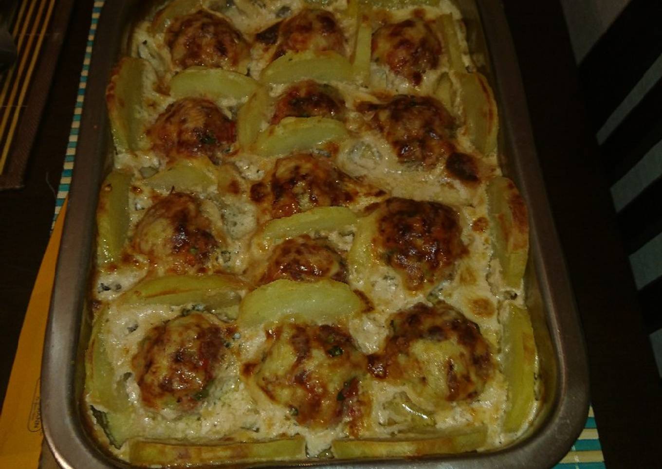 - Colocamos las papas cortadas en la base del recipiente y por los bordes. Colocamos las albóndigas sobre las papas para luego colocar entre las mismas albóndigas más papas.