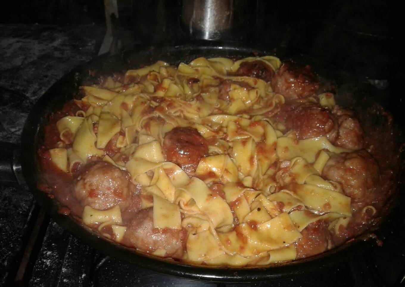 - 10 Minutos antes que la cocción este terminada agregar la leche (para corregir acidez) y 5 minutos después poner a cocinar los pappardelles en agua salada. Una vez listos agregar a la sartén y mezclar bien. Queso y listo!!!!